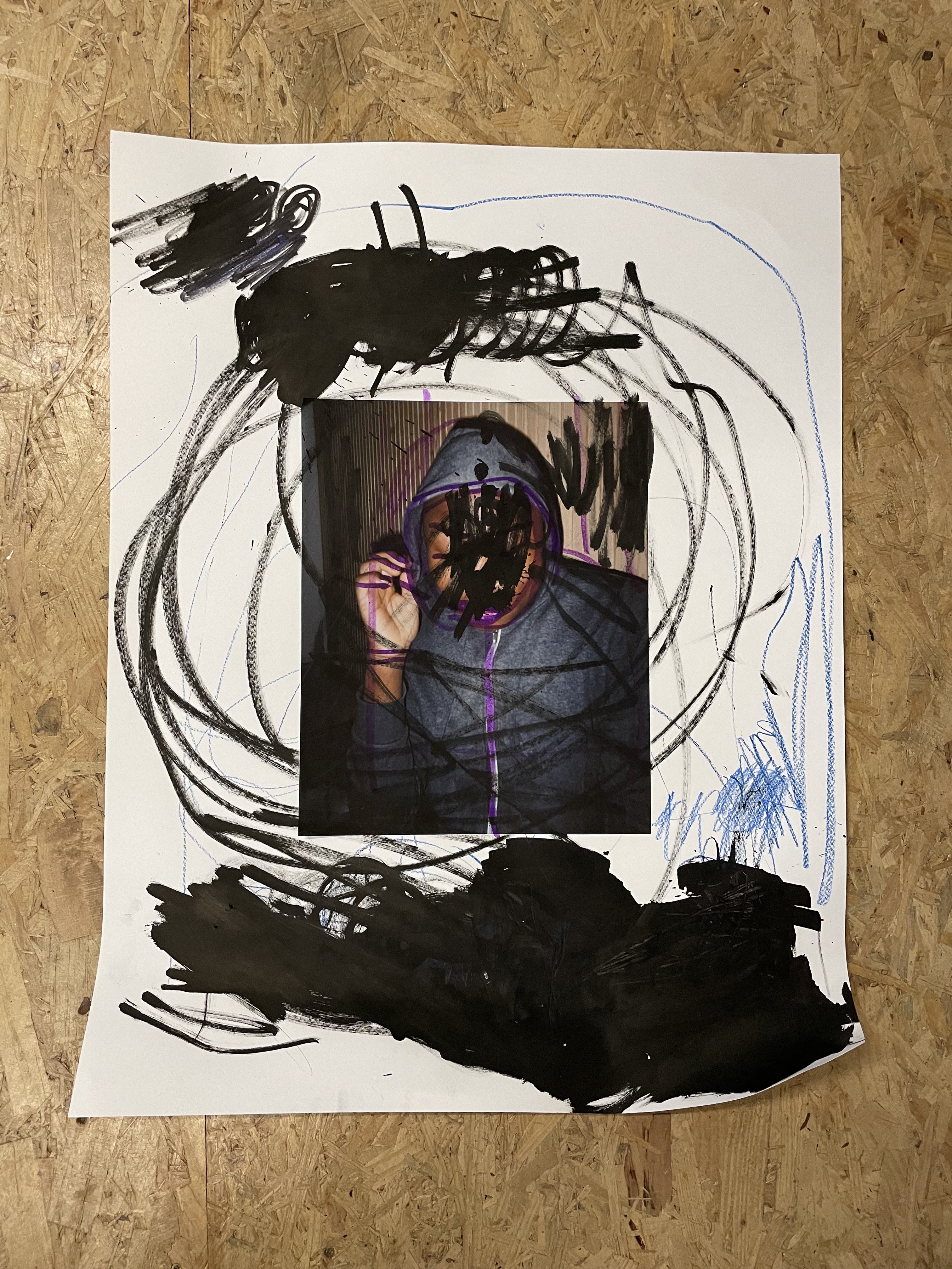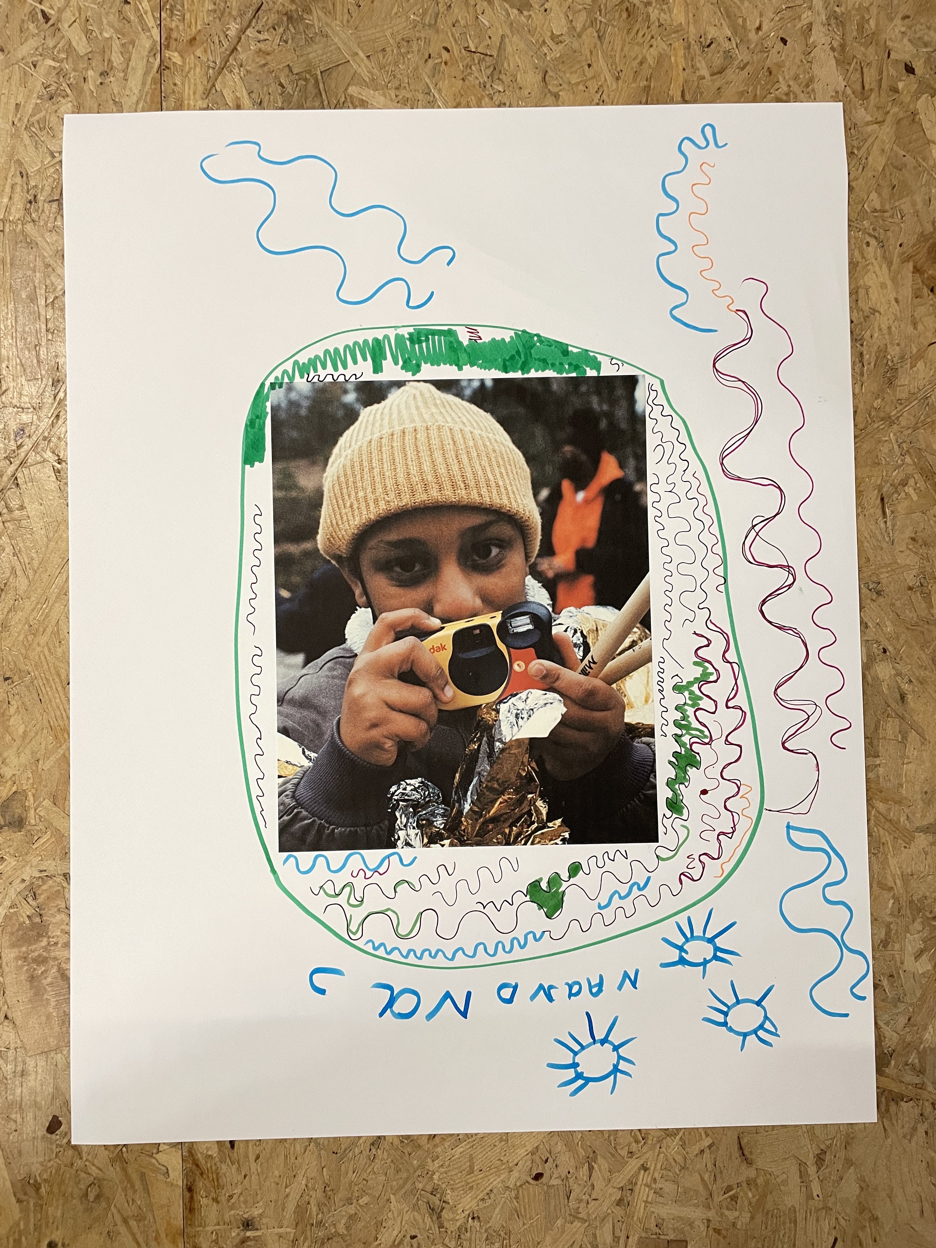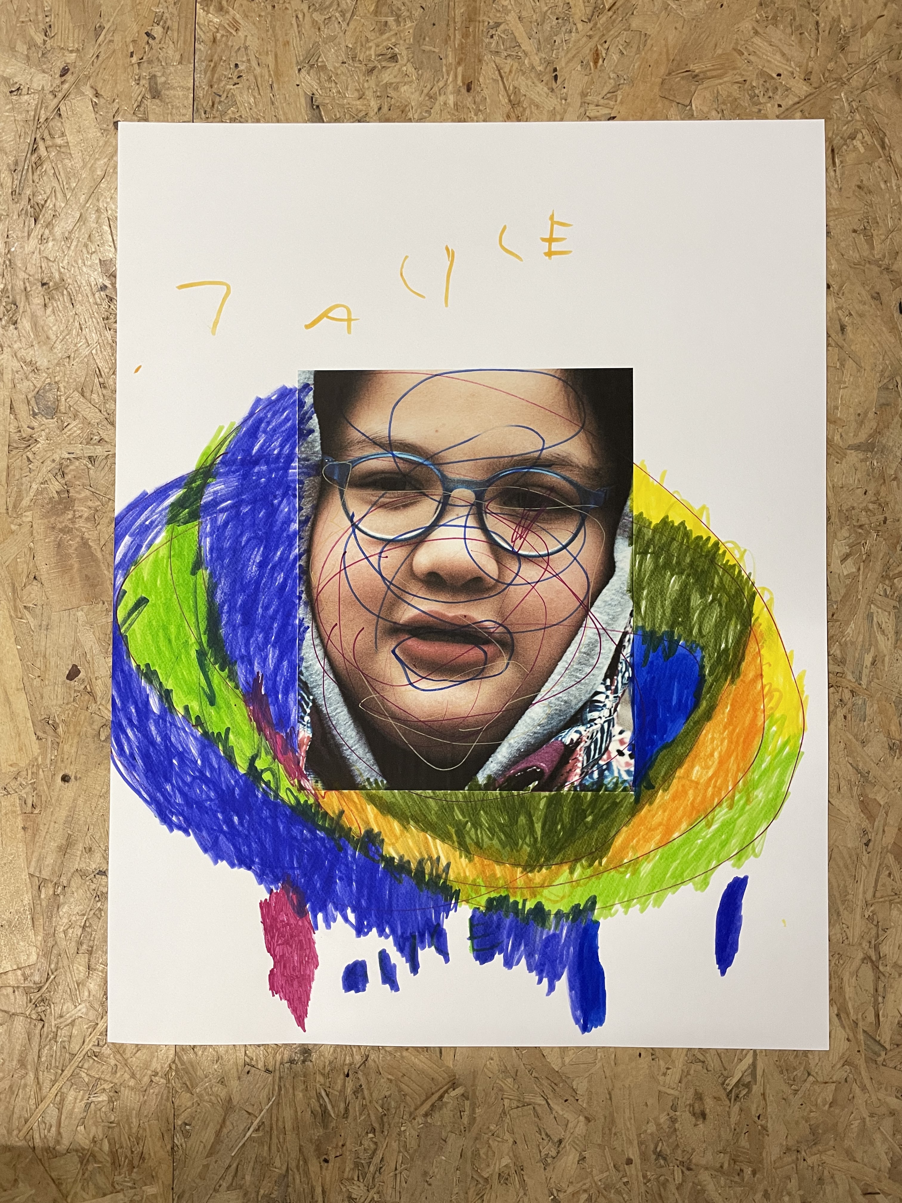 Photographies sur feuille canson avec un dessin de l’enfant sur sa propre image. Cette oeuvre a été réalisée avec la communauté du Silence des Justes.