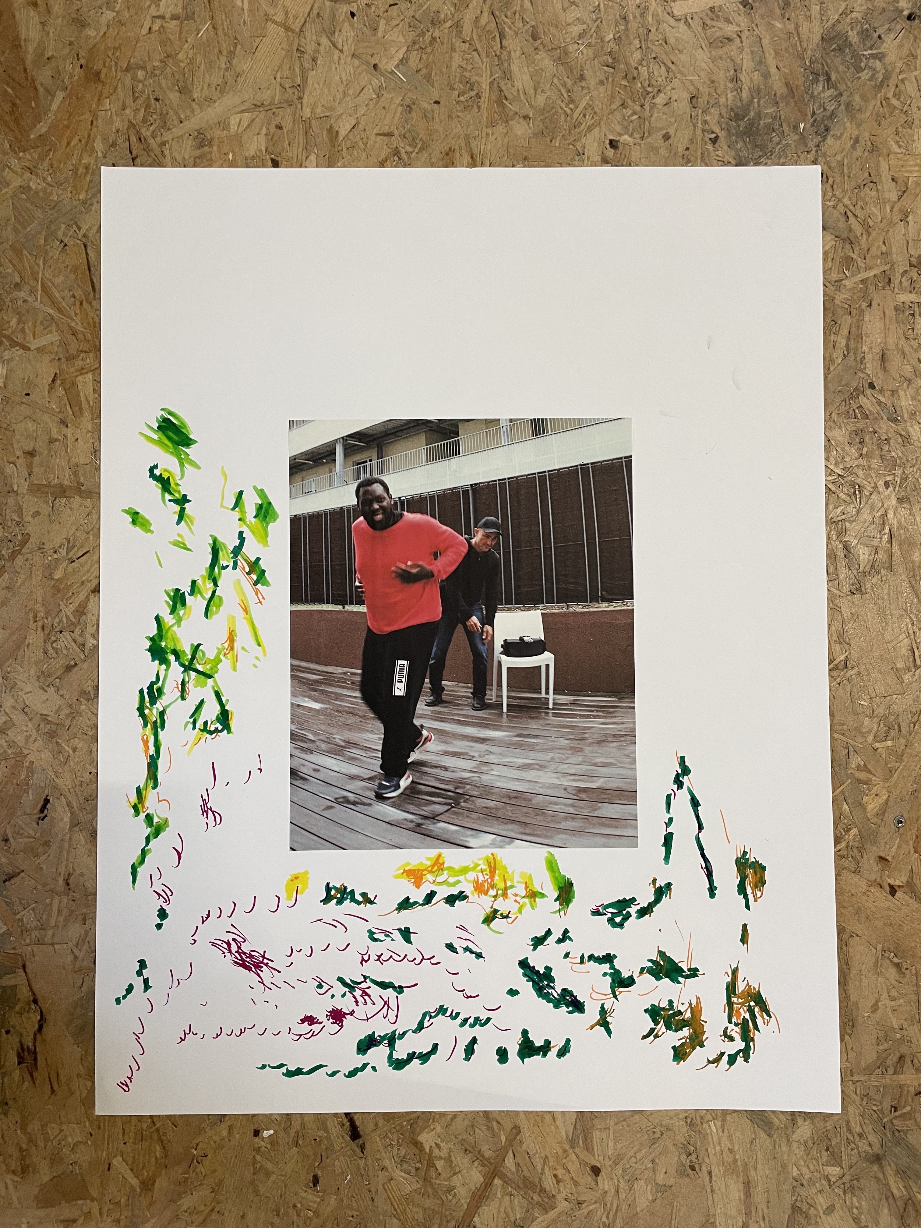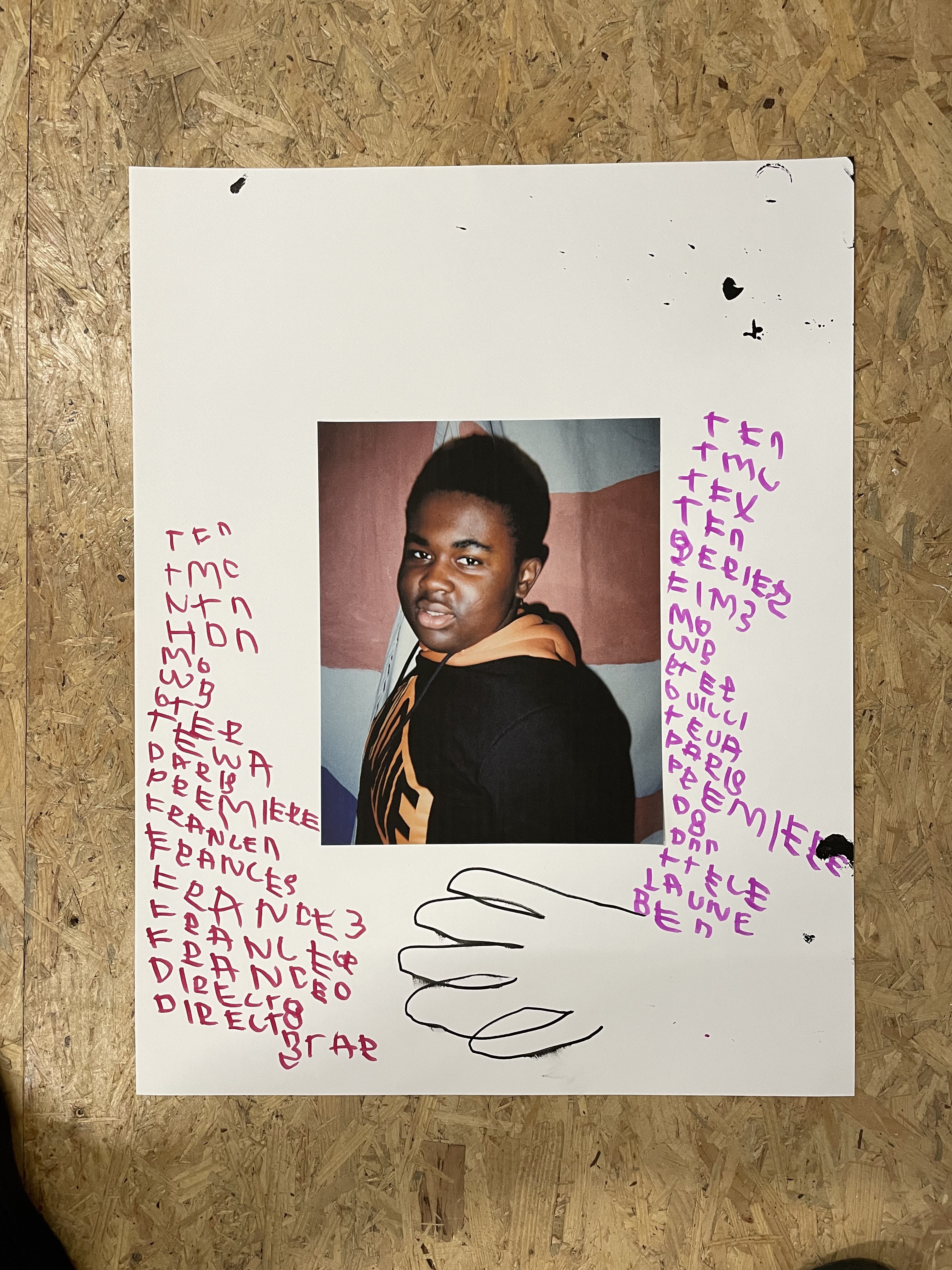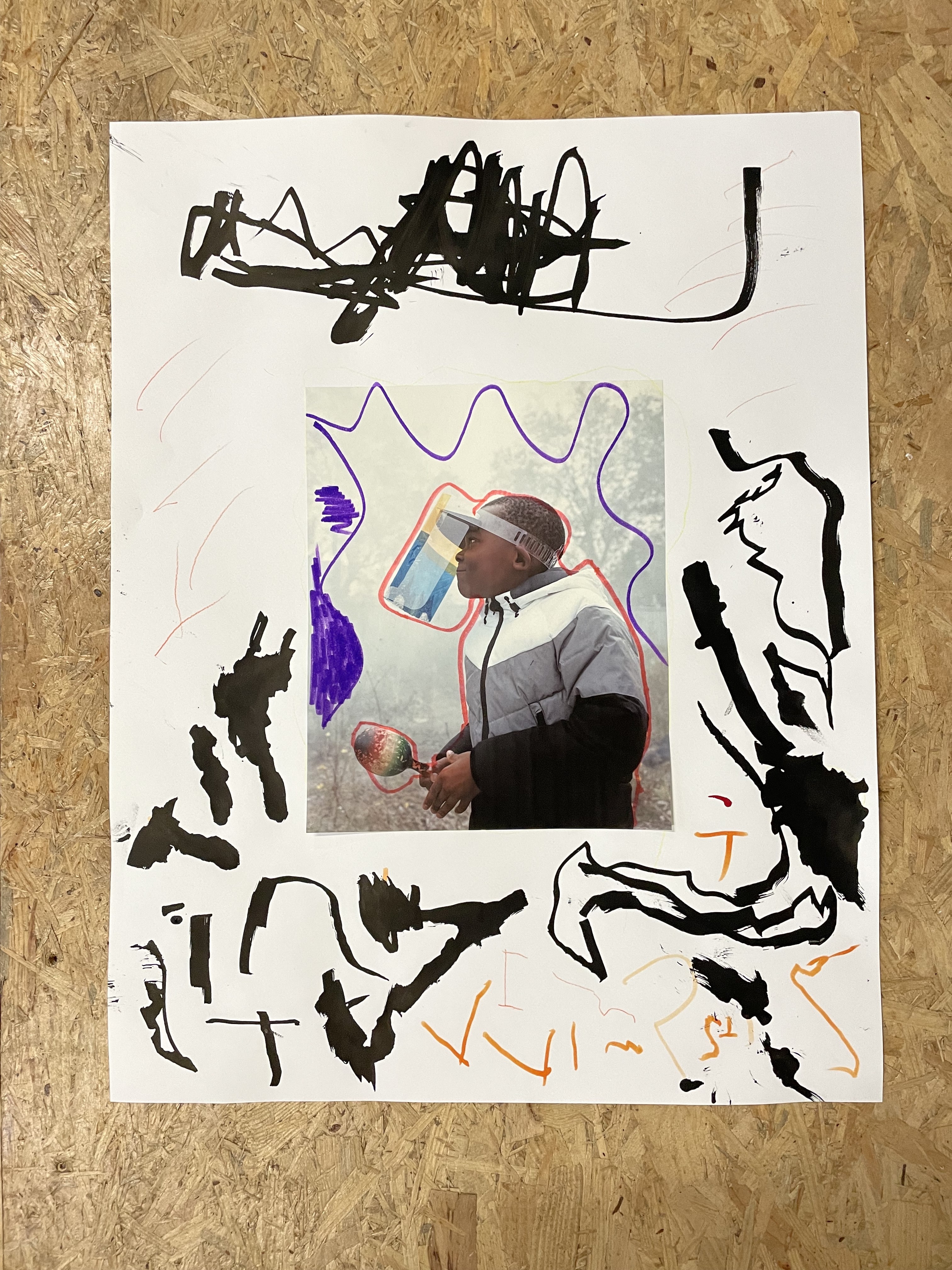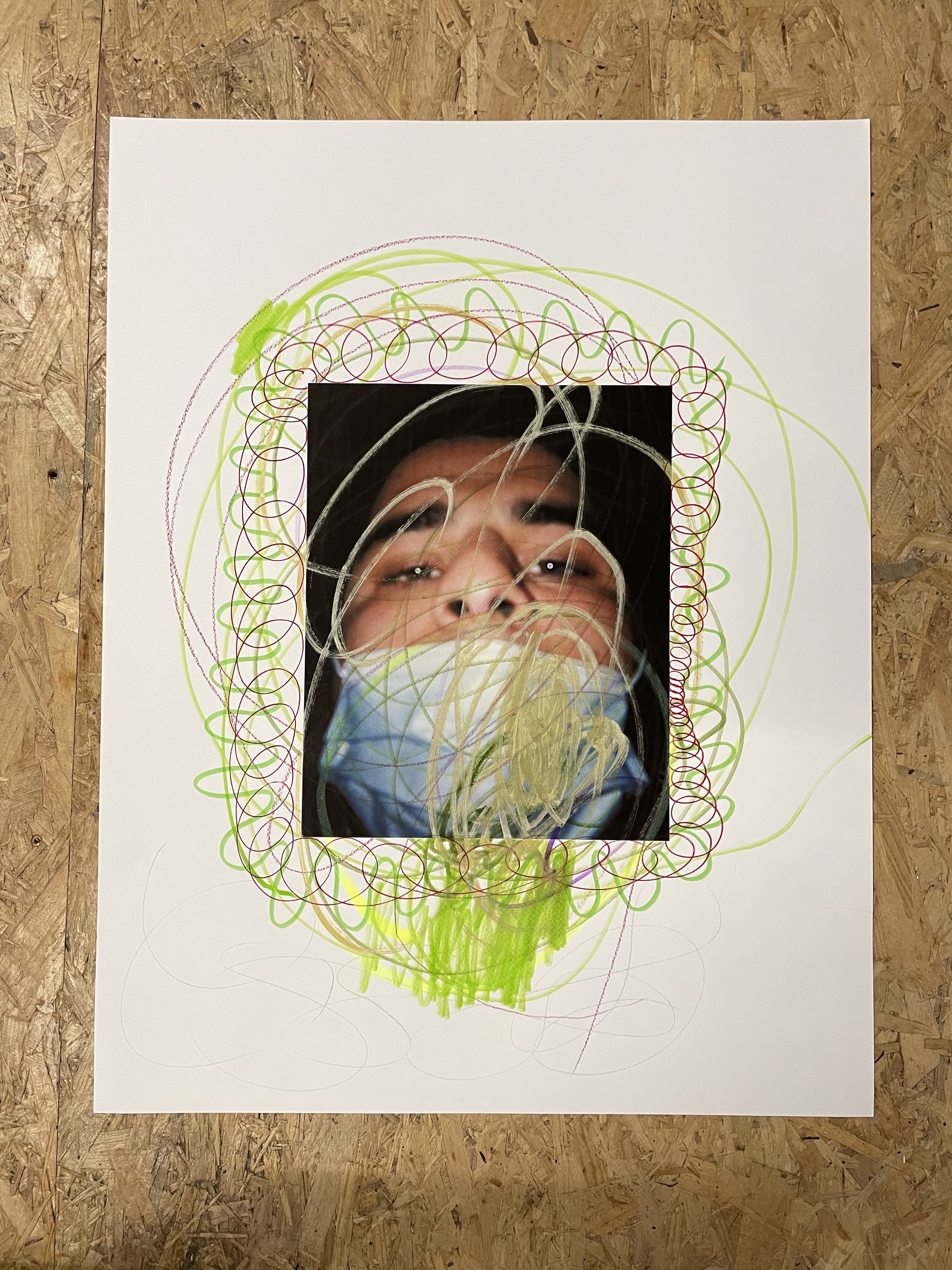 Photographies sur feuille canson avec un dessin de l’enfant sur sa propre image. Cette oeuvre a été réalisée avec la communauté du Silence des Justes.