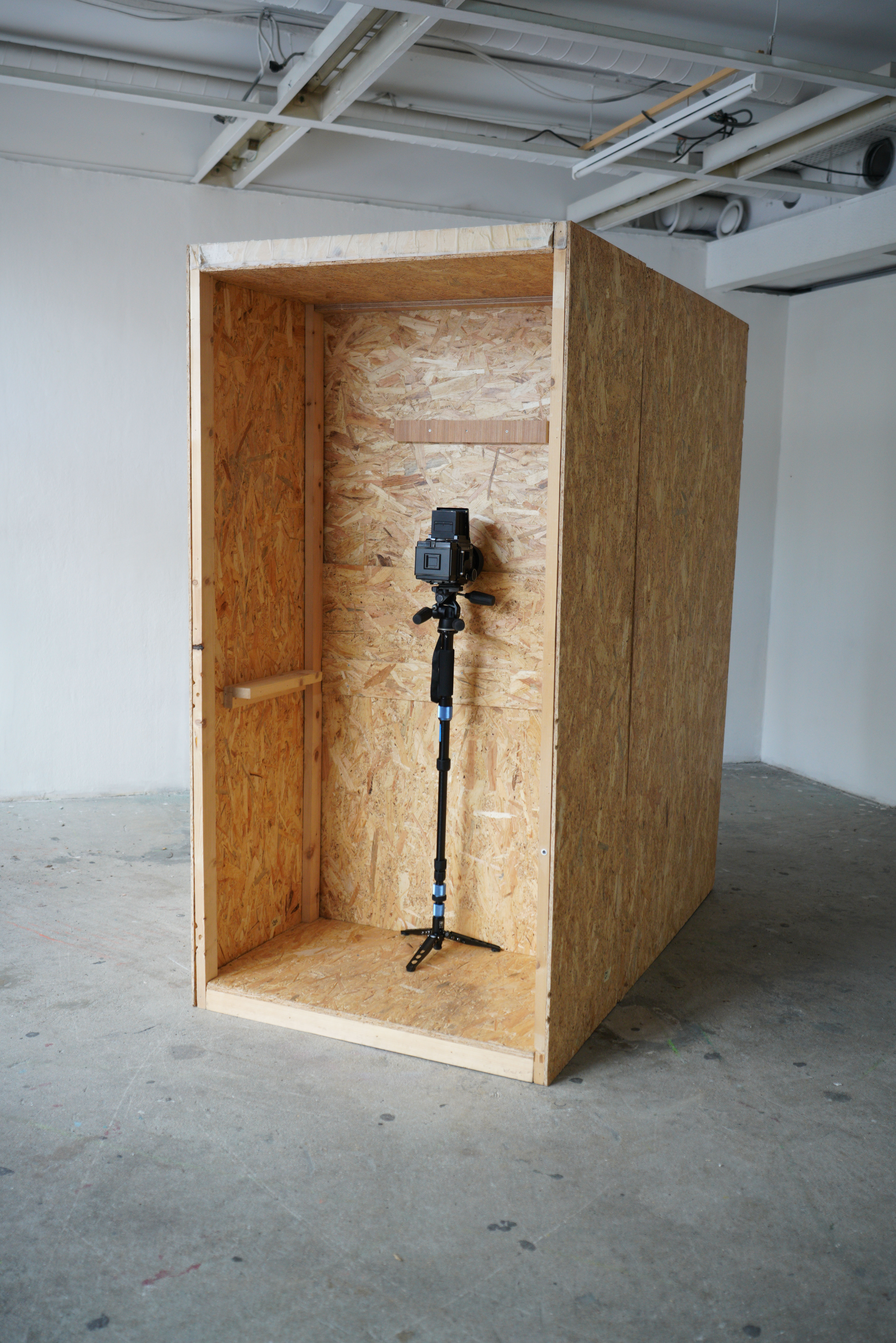 Le dispositif de la Memory Box est une boîte fermée qui soustrait la personne qui y entre à l’espace extérieur, pour la placer dans un environnement sonore et visuel à caractère méditatif, presque hypnotique. Au cours de cette session une photo est prise en plan américain, de face, de la personne qui se trouve à l’intérieur de la Box. L’image est ensuite diffusée dans un module rappelant la «camera obscura».