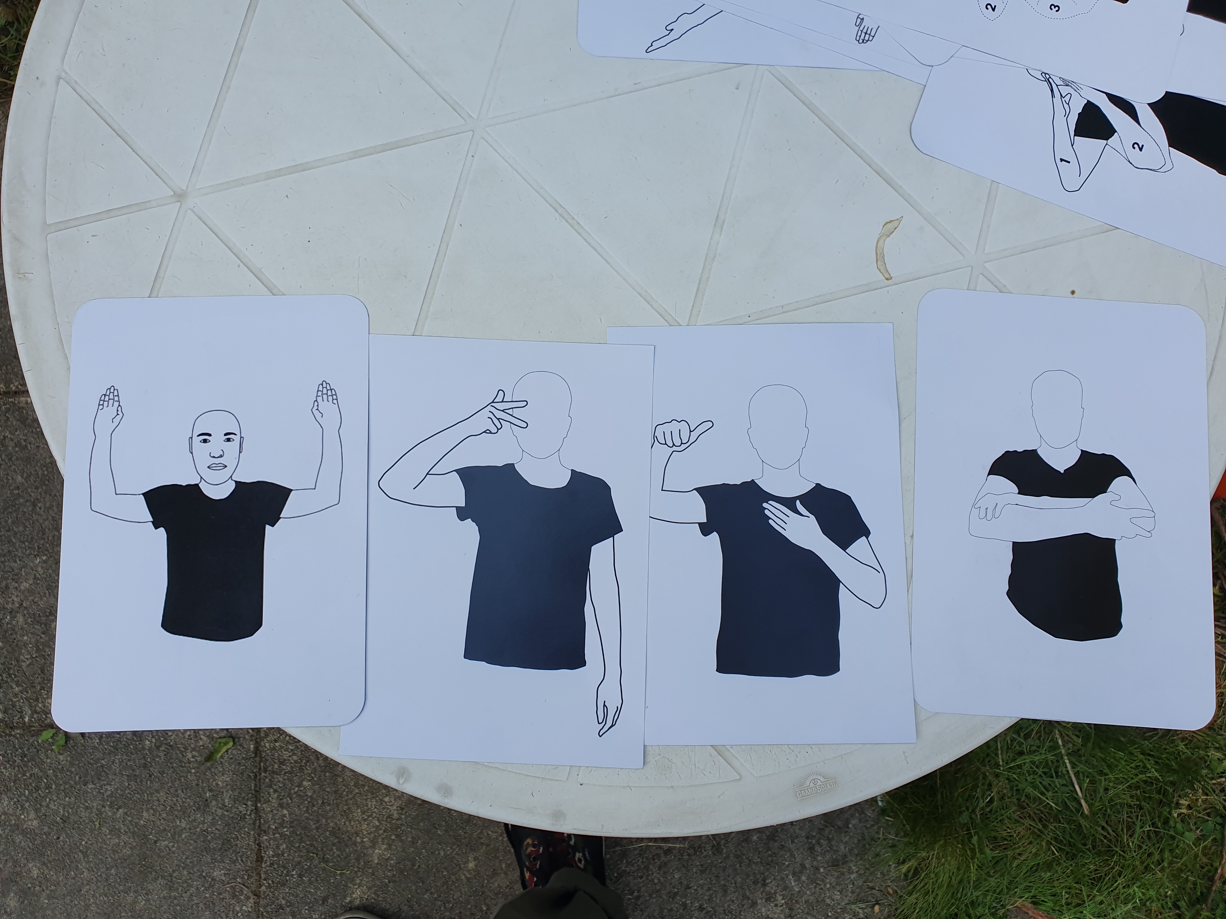 Jeux de 12 cartes bi-face (un coté texte un coté symbole) noir et blanc imprimé sur papier cartonné A5. Cette oeuvre a été réalisée avec les communautés de Bagnolet de la résidence des Floralies et de la résidence Marie.